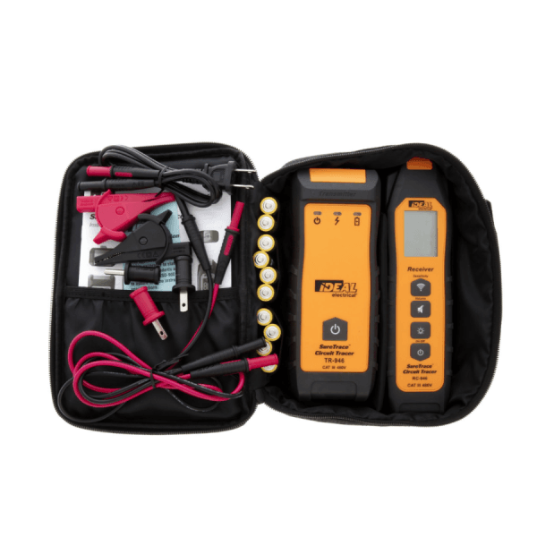 This comprehensive kit includes all necessary accessories. It comes with an AC receptacle plug, banana plugs, leads, alligator clips, and a ground adapter. These items are all stored in a durable, compact soft case. The Ideal 61-946 SureTrace Circuit Tracer is designed to be user-friendly. Its advanced features help save time and money by efficiently solving electrical issues.