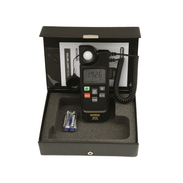 This light meter is powered by two AA batteries, providing approximately 80 hours of continuous use. With an auto power-off feature that activates after 30 minutes (and can be disabled for extended monitoring), the LM192 is designed for efficiency and longevity. An LCD display with a backlight ensures readability in all lighting conditions, further enhancing usability.