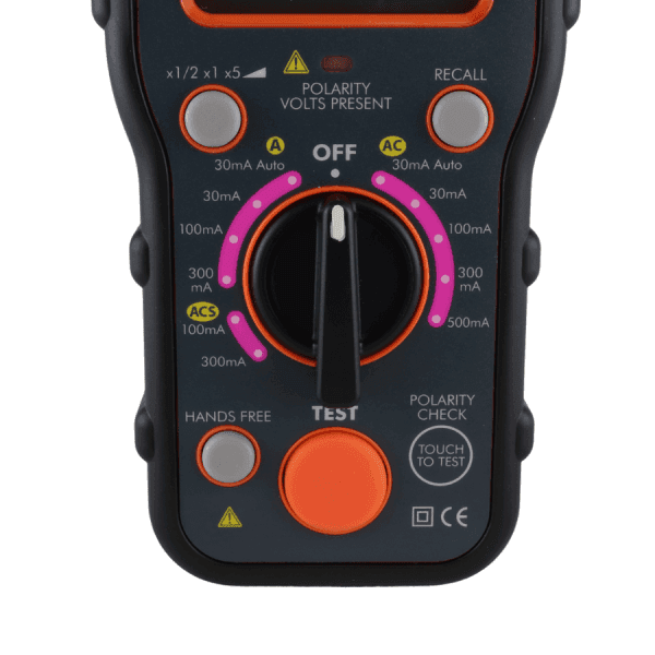 This test, suitable for A and AC type RCDs, checks the mains for correct polarity and voltage. If the parameters are right, the Volts Present LED turns green, allowing the test to proceed. Upon pressing the test button, the auto test performs X½, x1, and x5 tests at both 0º and 180º automatically. Users can view the results by toggling through them with the recall button.