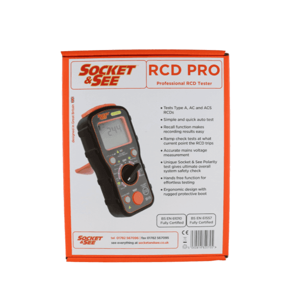 The Socket & See RCD PRO complies fully with BS EN 61010 and BS EN 61557 standards, and meets EMC compliance as per BS EN 61326.
