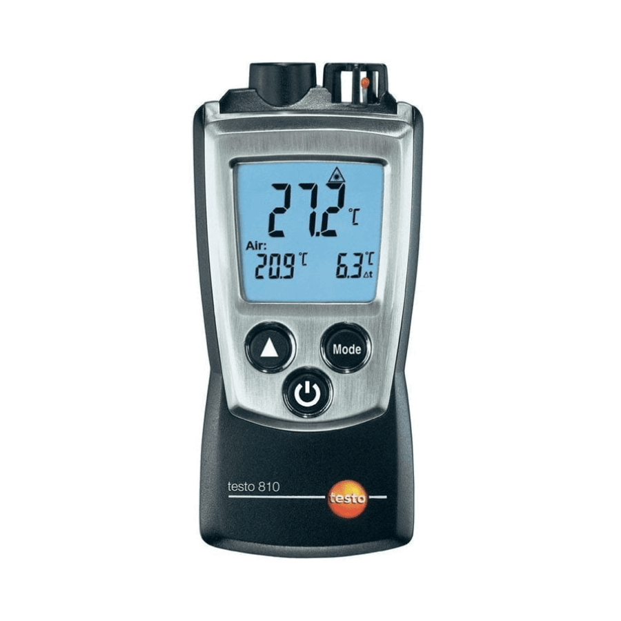 The Testo 810 Infrared Air Temperature Thermometer makes measuring both air and surface values simple and reliable. It works by combining an infrared sensor for surface temperature checks with an NTC sensor for ambient air. Both readings are taken at the same time, giving the user a clear view of temperature differences between the two. This design is especially useful in HVAC checks where quick comparisons are needed.